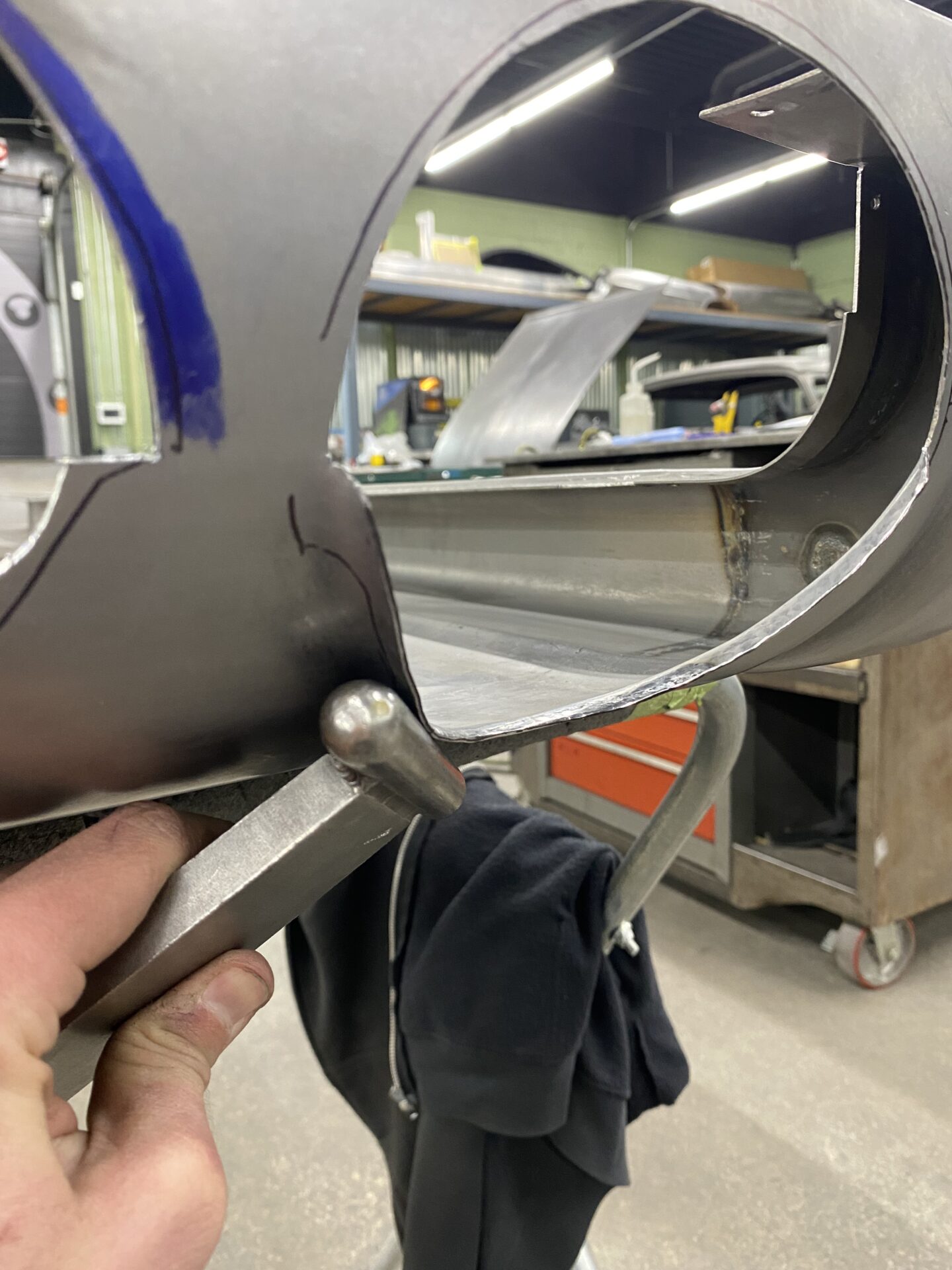A GSI Machine and Fabrication chassis was utilized to begin the project with a solid foundation. The rear suspension was modified to fit the massive pro-street style rear tires rolling on custom 20” Budnik wheels. Powering this behemoth is an LS3 crate motor and automatic transmission mounted in the engine’s original location under the cab floor. The engine is accessible from a removable floor section. The engine and transmission can be removed out the bottom of the vehicle if any major overhauls are needed in the future.