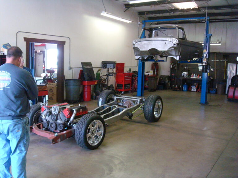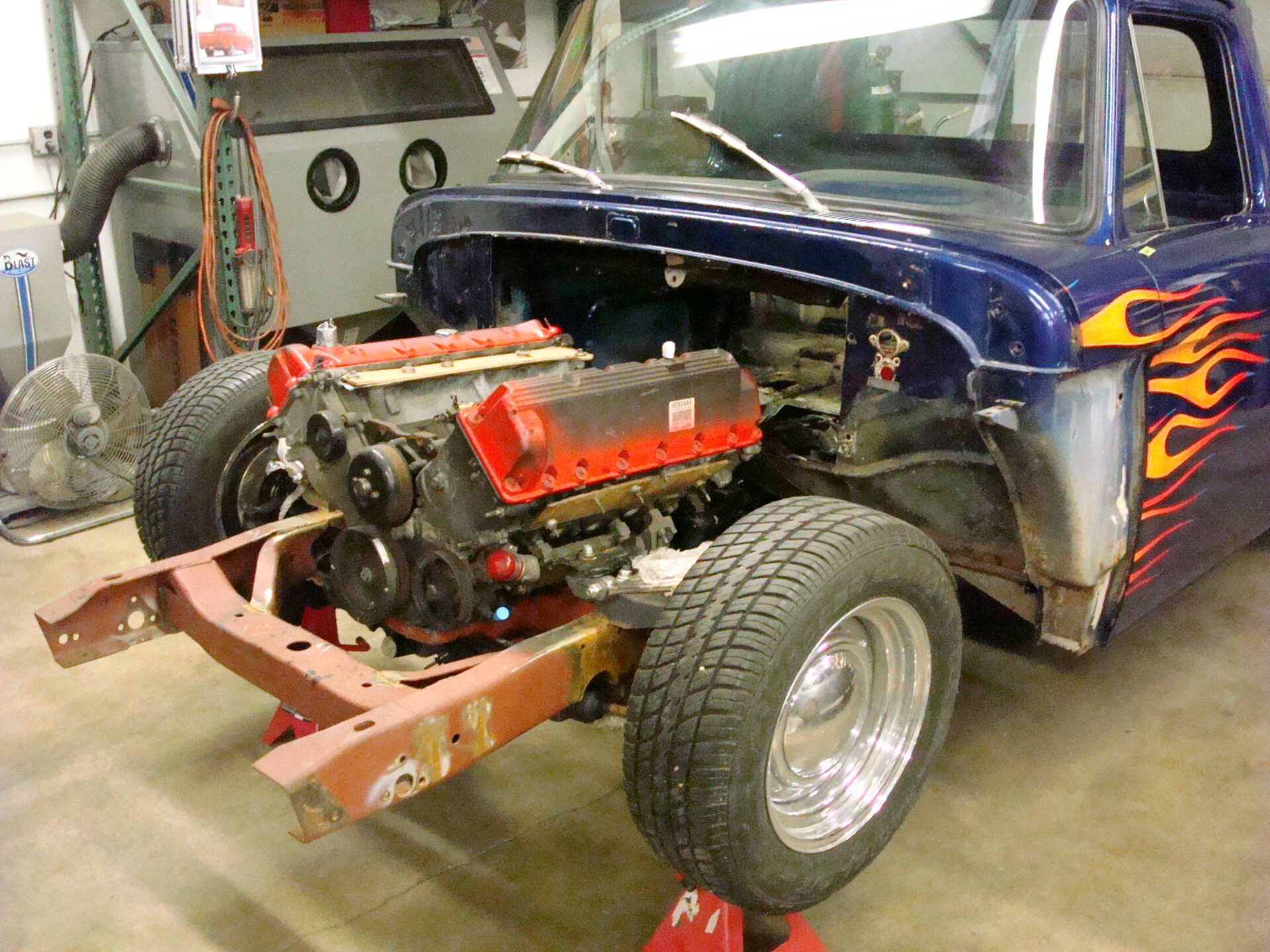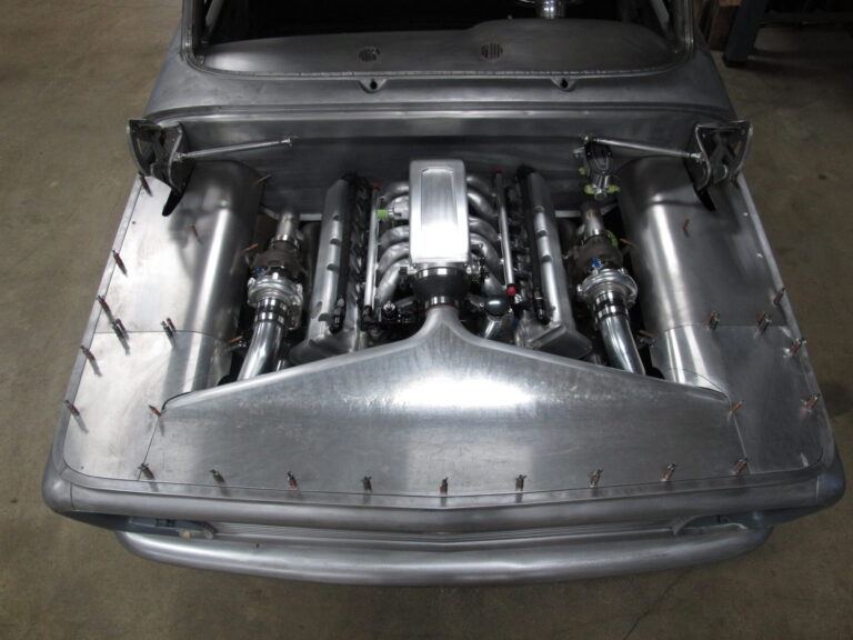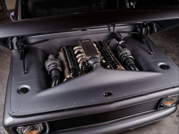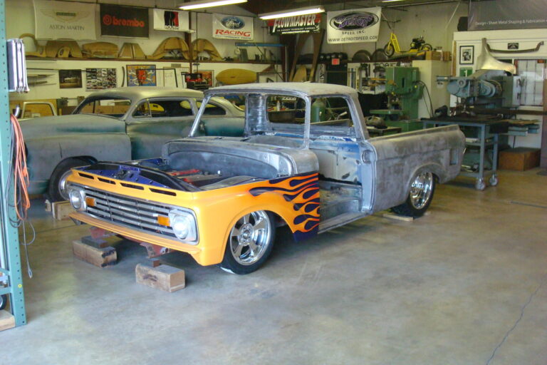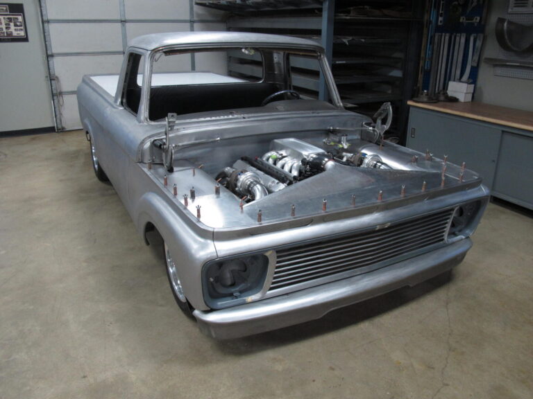 With concept sketch and renderings in hand, John teamed up with his son Jeff Lamb to tackle the running gear. This included the twin-turbo version of a Triton V-10 that Jeff was quite familiar with. This required a new crossmember, independent front suspension, and custom oil pan. Then it was time to get Brian and the rest of the crew at TMG involved to tackle the floor and firewall. After the front of the truck was set, focus was then on the rear four-link suspension, fabricated 9” housing, and truck’s stance. The wheel and tire combination was determined during this phase of construction.