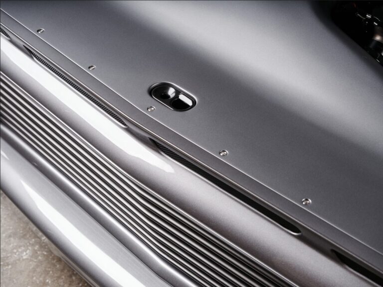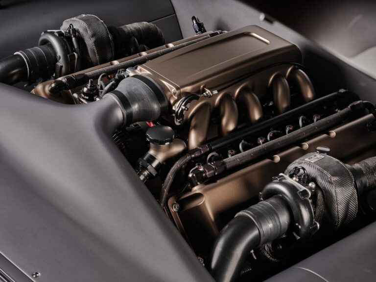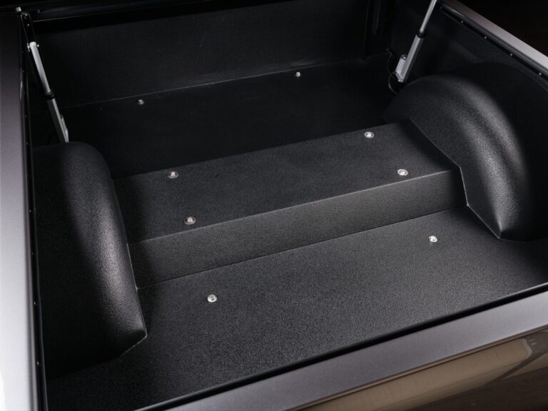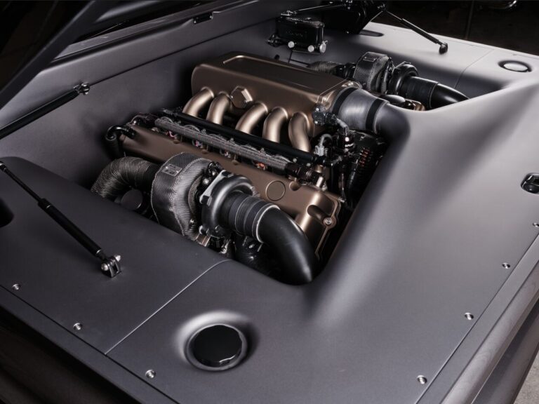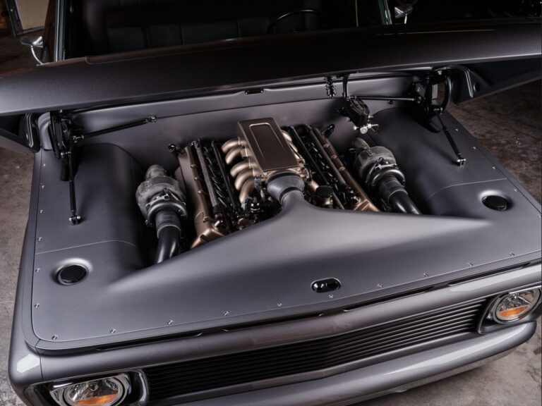 The bodywork and paint on this pickup is over the top. The body panels have been worked over thoroughly together as a whole to get the truck straight. The goal was to make the truck’s body appear as if it were cut out of one piece of granite stone and then polished. The deep metallic Mercedes Grau paint has been color-sanded and buffed to perfection, making this truck look like a wet mirror. The cherry on top is the custom V10 logos that were machined into the hub caps and the steering wheel’s horn button.