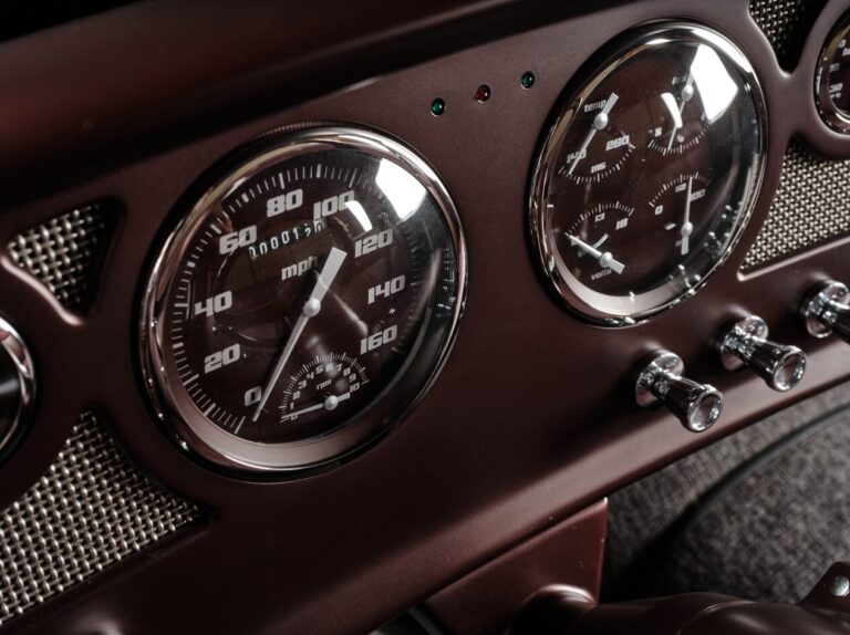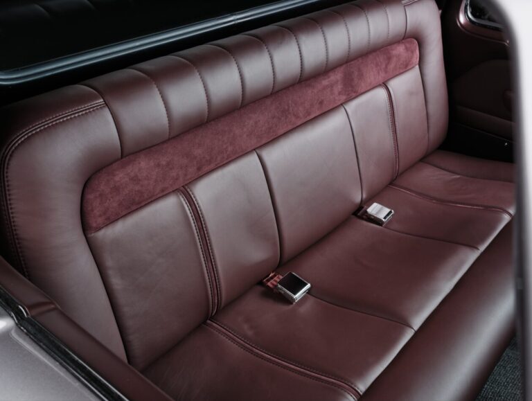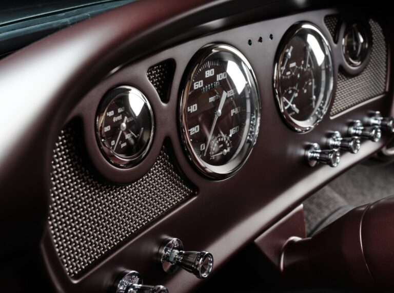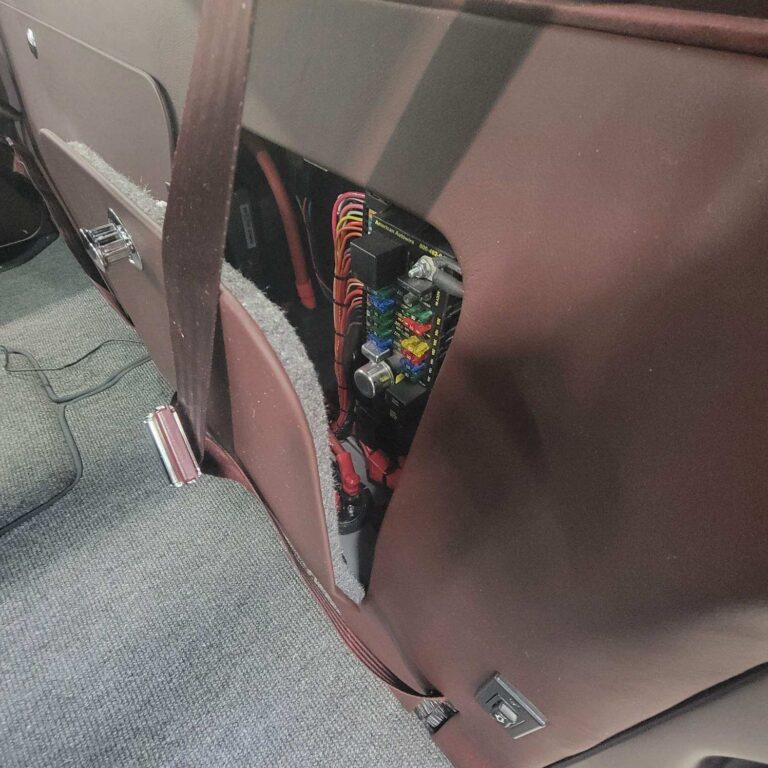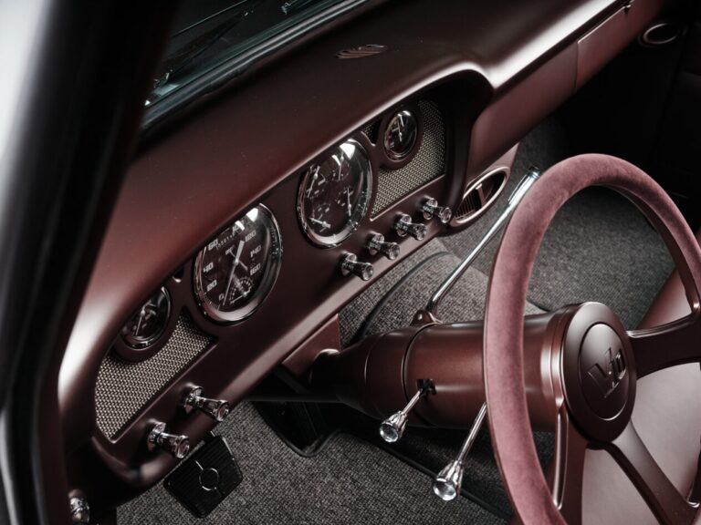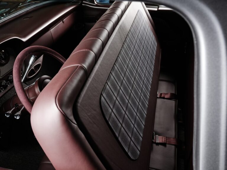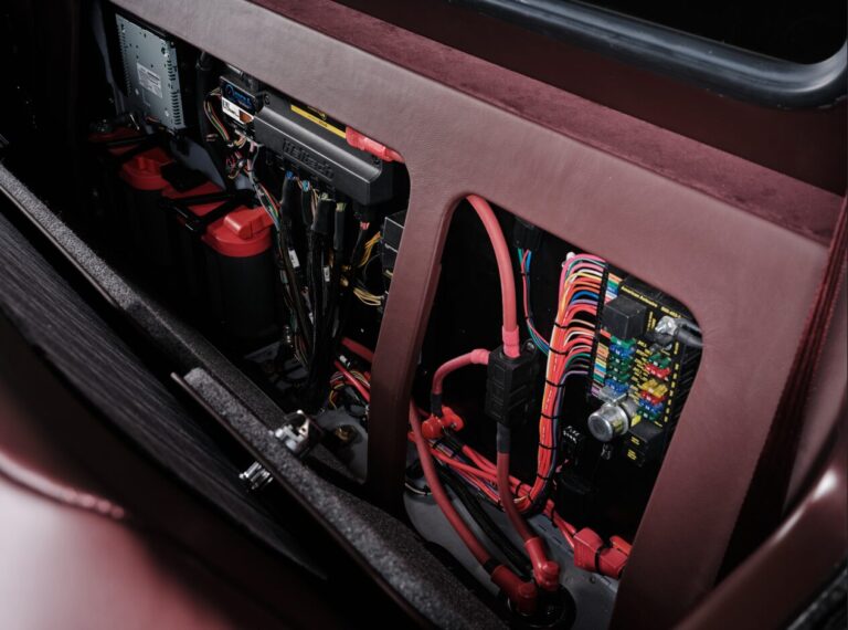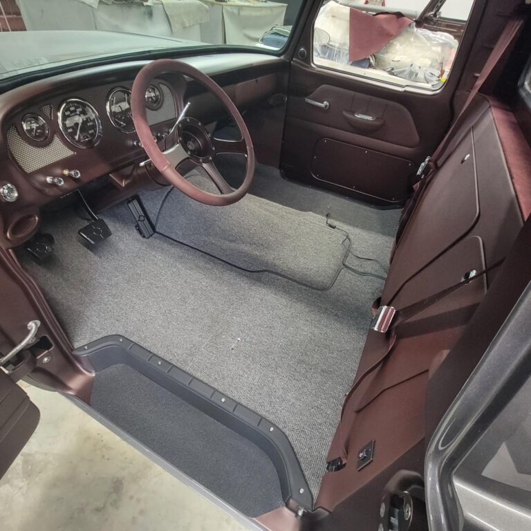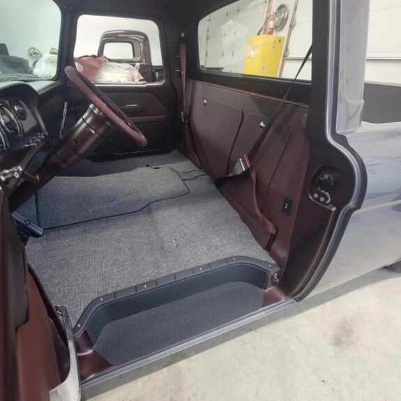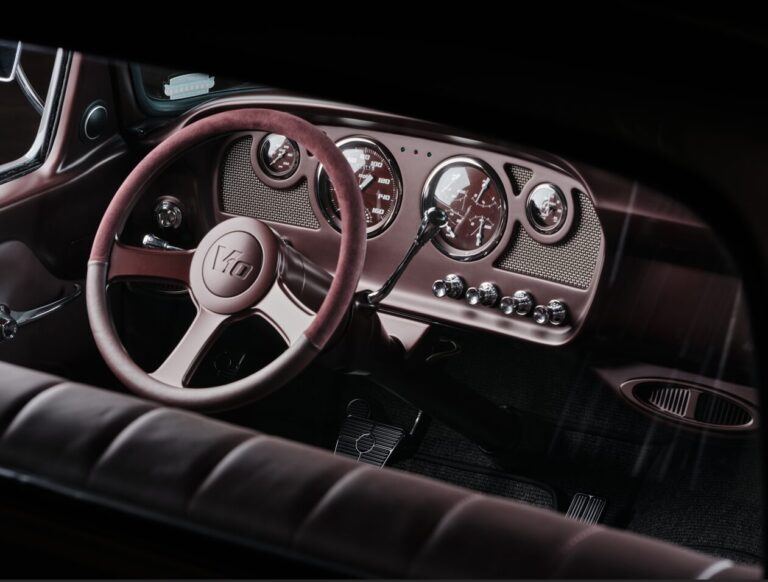 The interior was also cleaned up by smoothing the dash and building a custom gauge cluster that was welded in and recessed the custom Classic Instrument gauges. The inside of the cab was painted with a satin Maserati Rame color with luxurious maroon Italian leather and suede to match. Rounding out the interior is a matching headliner and bench seat flanked by some gray-toned plaid fabrics with a maroon accent. Hidden is the wiring and all the electronics engineered to mount behind the bench seat. Here you’ll find the two batteries, engine management, fuse panel, ground distribution blocks, relays, etc. Some easily removable panels were fabricated to gain quick and easy access.