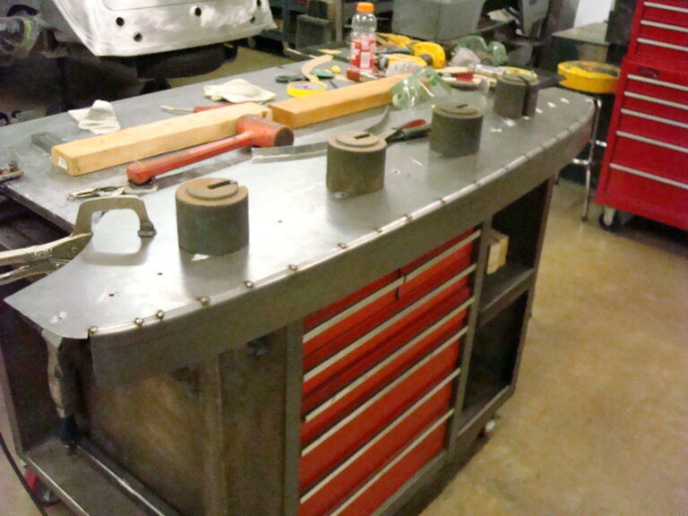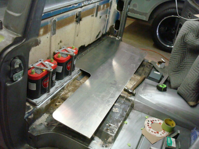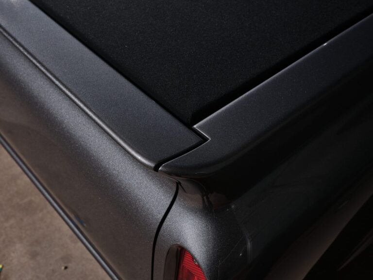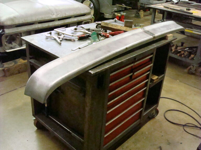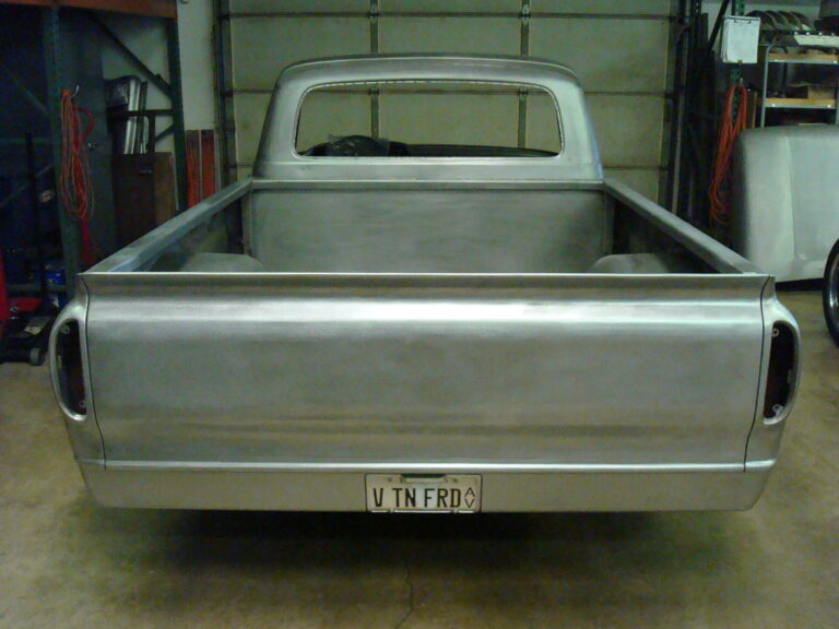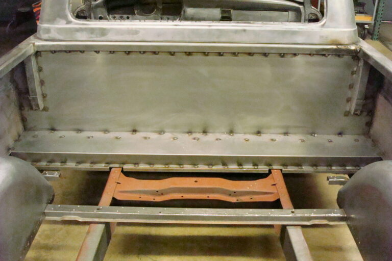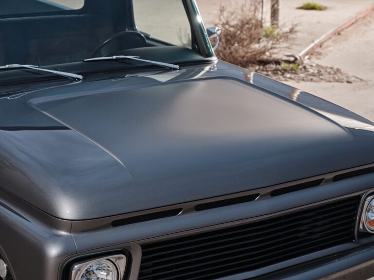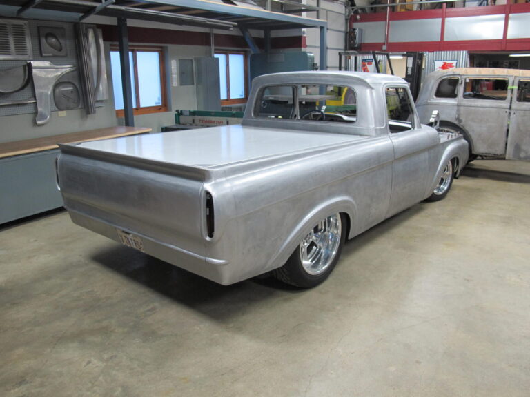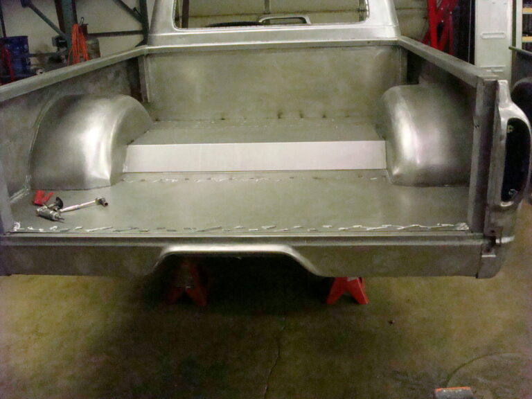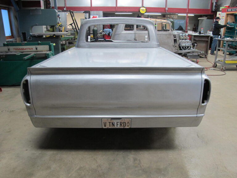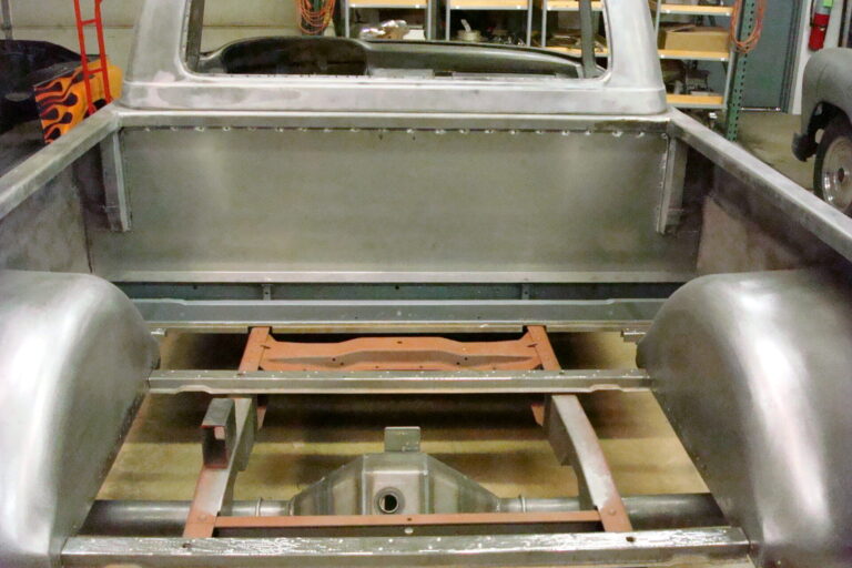 With the short block and transmission in a good place, sheet metal fabrication began on the bed floor, working our way back to the custom tailgate that included a small wing inspired by the original rear roof design from the back of the cab. The now smooth one-piece tailgate was armed with hidden hinges, and its handle was moved to the inside. At the same time, a new roll pan was made to fit below the tailgate, complete with a frenched-in license plate. The taillight housings were removed and straightened, and a hammer form was created to make the original taillight lenses fit more precisely. These newly formed sheet metal pieces were blended into the original taillight housing sheet metal/bed corners. To better clean up the bed area, a custom aluminum flush-mounted tonneau cover was fabricated, also allowing room for storage in the bed. The cover was eventually wrapped in black hearts cloth for a more elegant look.