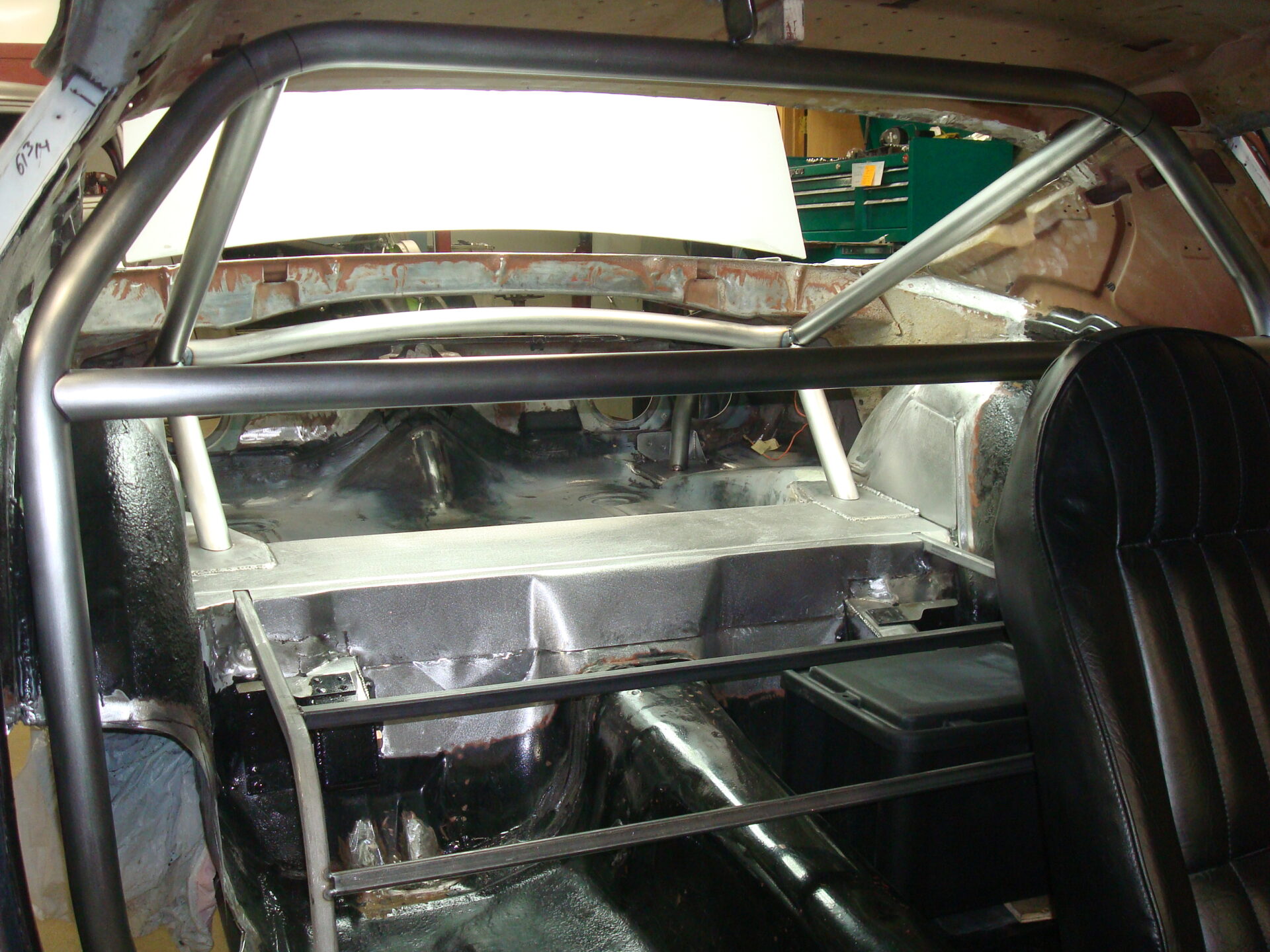 Inside the cockpit, you’ll notice a handful of drastic changes from its original configuration. The most obvious is the lack of any dash structure in the vehicle. The custom-formed chromoly tube roll cage snakes through the interior purposefully. The only thing directly in front of the driver is the minimalist gauge cluster that floats above the steering column support cross tube. The seats have been moved back to create a two-seater driving experience. The driver’s side pedal box houses the new brake and throttle pedal assembly, complete with custom non-skid aluminum foot plates.