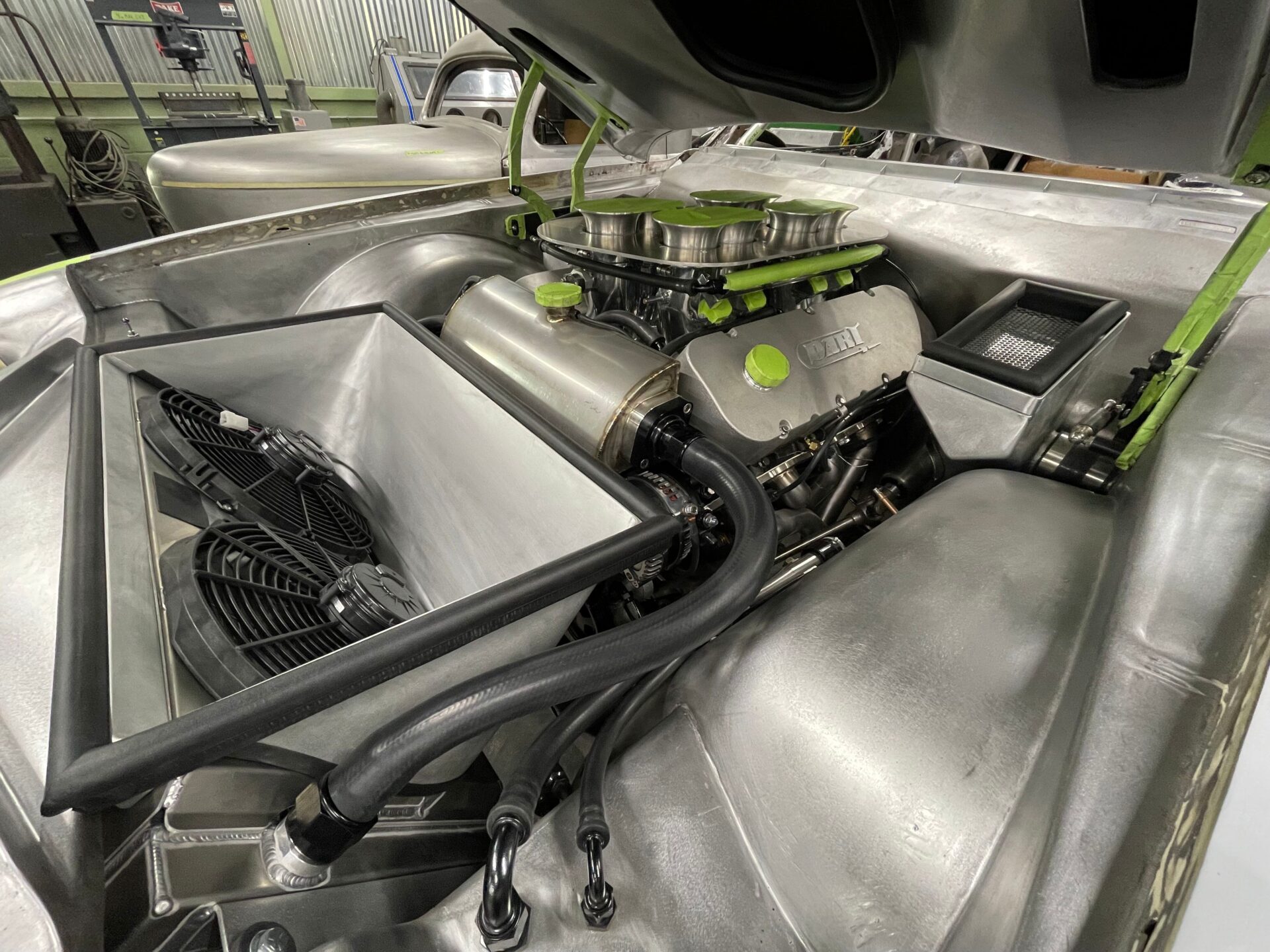 Some obvious custom fabrication efforts include the firewall, pedal boxes, fender wells, and radiator shroud. The least obvious custom effort is the fresh air ducting that enters through the original turn signal openings and continues to flow over the inner fenders into custom filtered air boxes that seal to the hood and force fresh air directly into the stack injection. The custom expansion and radiator reservoir/fill tank was constructed and neatly nestled in the front of the engine. At the same time, the pulley-driven accessories were moved down under the radiator shroud to keep as much weight as low as possible.